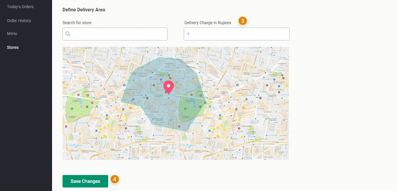 3 - Under the Define Delivery Area, there is an option named ”Delivery Charge in Rupees”. Enter the new delivery charge in the box.