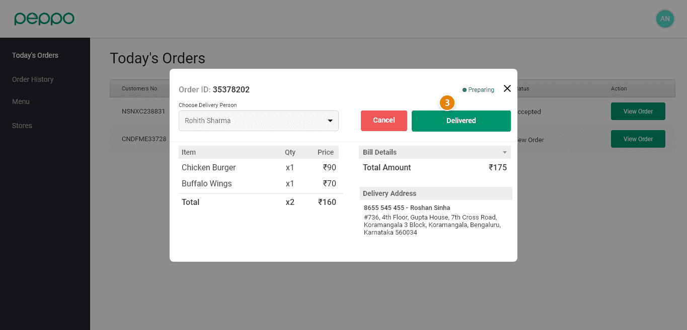 3 - You will find a “Delivered” button in this pop-up as shown in the image below. Please click on that and your order has been marked.