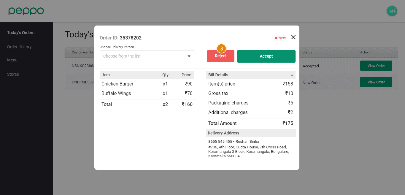 3 - Click on the ‘Reject’ button to reject an Order. The alarm will stop once you reject the order.