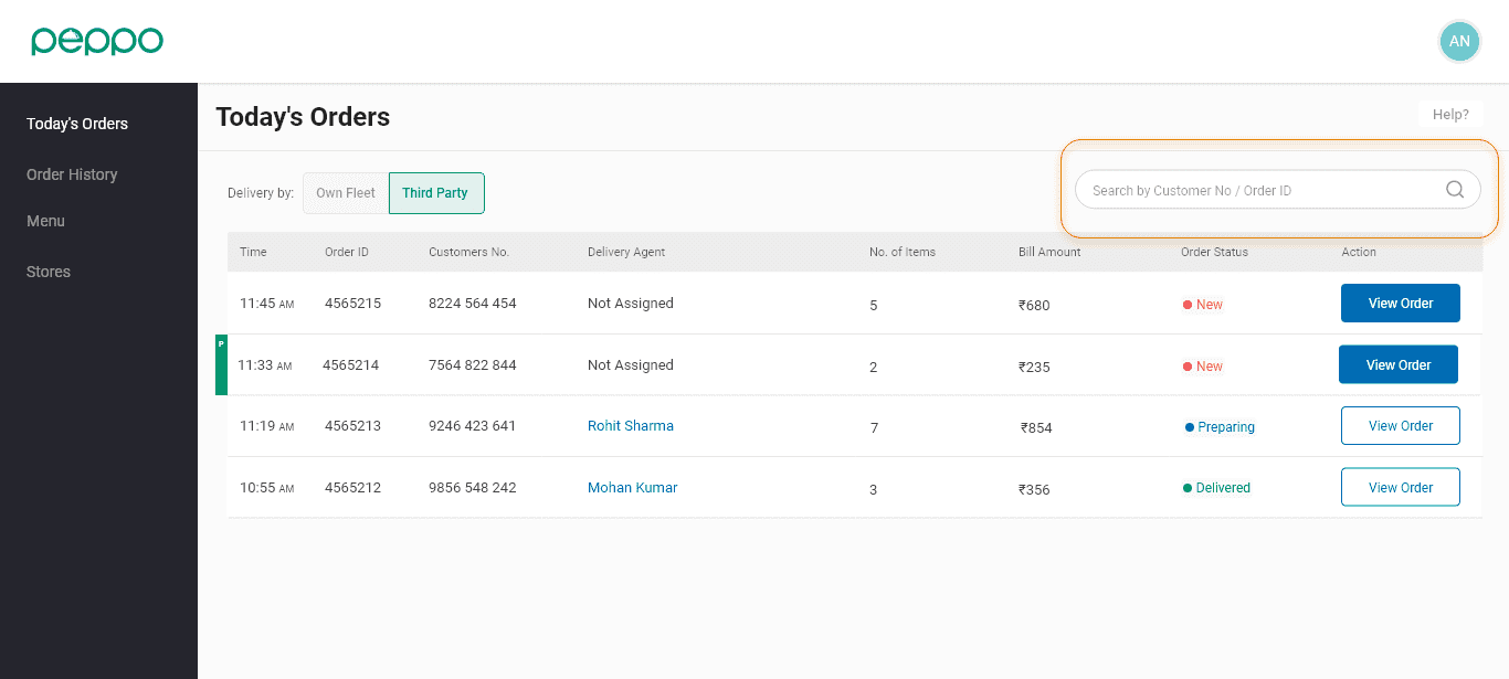 You can search for an order by entering the Customer’s phone number or the Order ID in the text box on the top right corner on Today’s Order tab as shown in the image below.